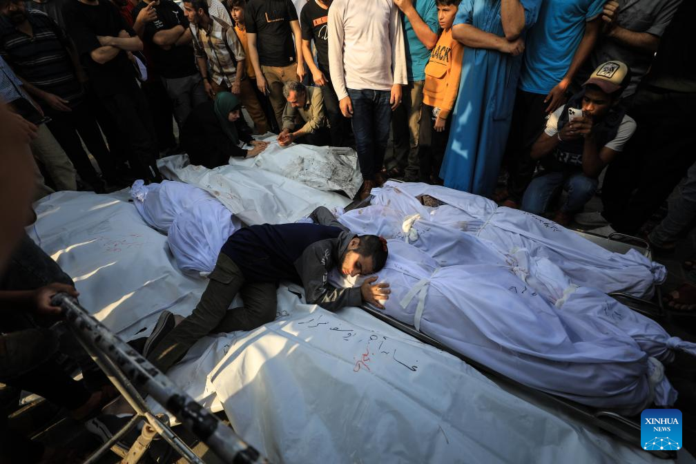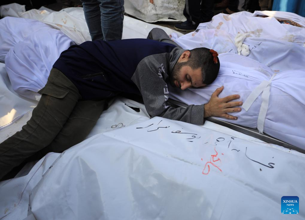 A Palestinian man mourns for the death of his relatives, following Israeli airstrikes, at a hospital in southern Gaza Strip city of Khan Younis, Oct. 24, 2023. The death toll of Palestinians from Israeli airstrikes on the Gaza Strip has risen to 5,791, the Hamas-run Health Ministry said on Tuesday. (Photo by Yasser Qudih/Xinhua)