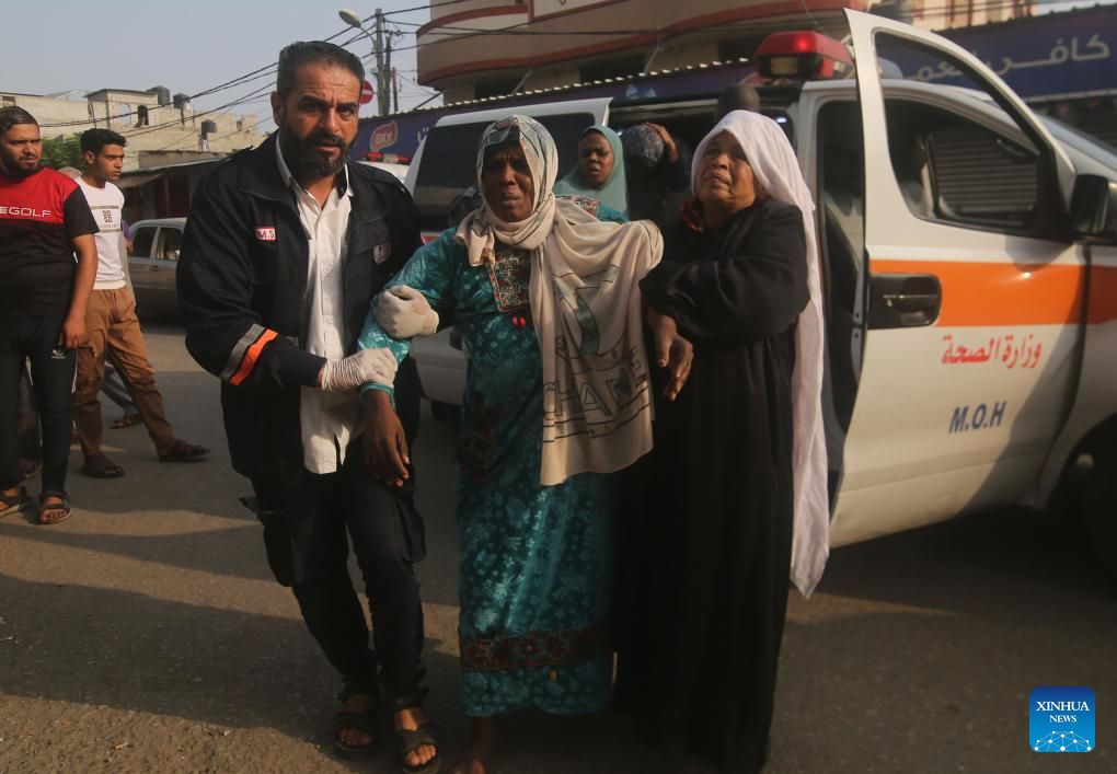 People transfer the injured to a hospital after Israeli airstrikes in the southern Gaza Strip city of Rafah, Oct. 24, 2023. The death toll of Palestinians from Israeli airstrikes on the Gaza Strip has risen to 5,791, the Hamas-run Health Ministry said on Tuesday. (Photo by Khaled Omar/Xinhua)