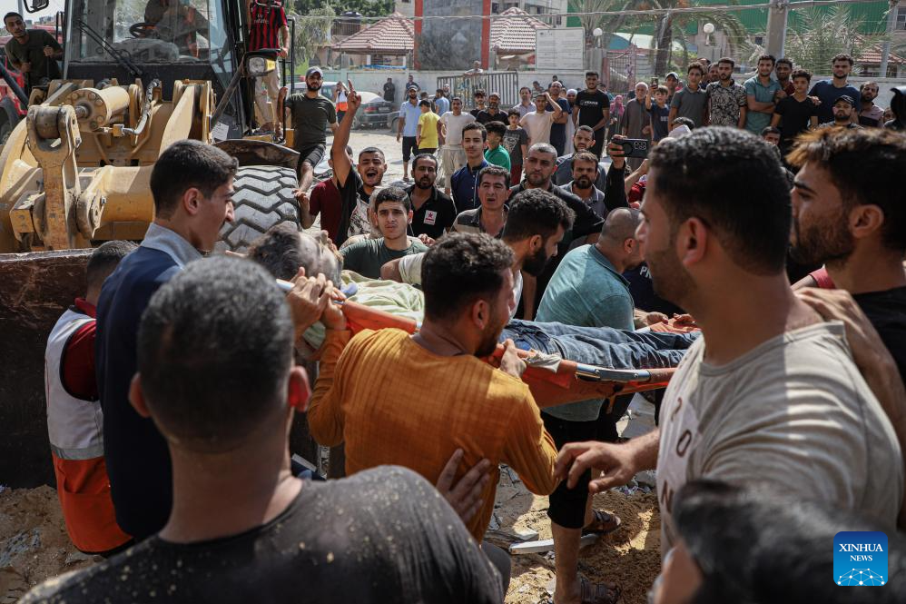 People carry a man rescued from collapsed buildings after Israeli airstrikes in the southern Gaza Strip city of Khan Younis, Oct. 24, 2023. The death toll of Palestinians from Israeli airstrikes on the Gaza Strip has risen to 5,791, the Hamas-run Health Ministry said on Tuesday. (Photo by Rizek Abdeljawad/Xinhua)