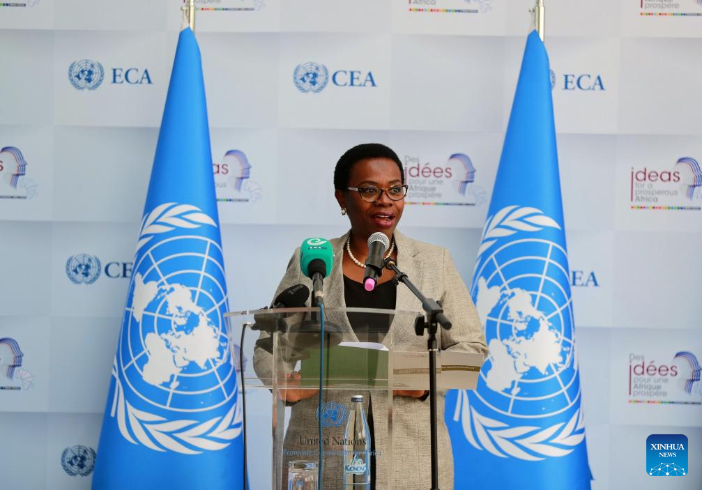 Deputy Chairperson of the AU Commission Monique Nsanzabaganwa speaks at an event marking the UN Day in Addis Ababa, Ethiopia, on Oct. 24, 2023. (Xinhua/Wang Ping)