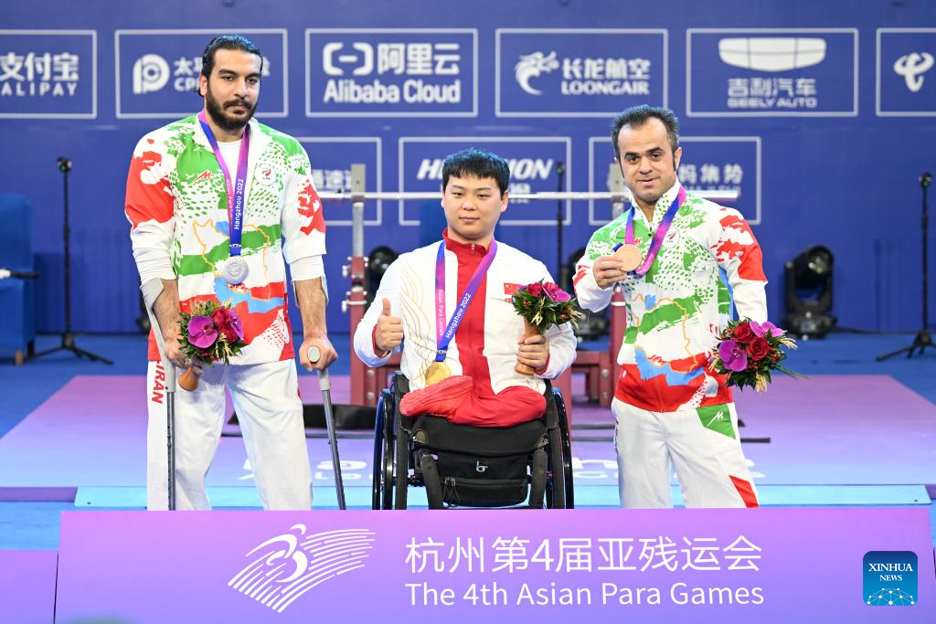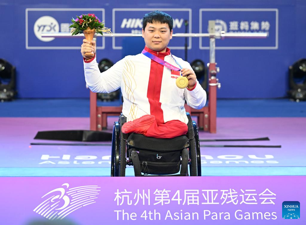 Gold medalist Qi Yongkai of China attends the awarding ceremony for the Men's 59kg of Powerlifting at the 4th Asian Para Games in Hangzhou, east China's Zhejiang Province, Oct. 24, 2023. (Xinhua/Bei He)