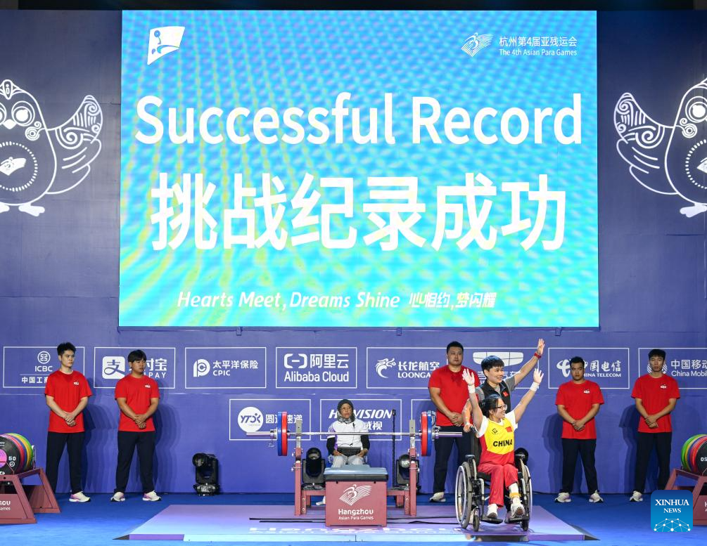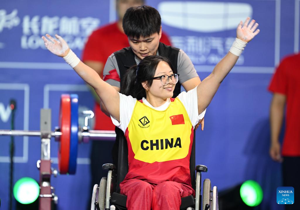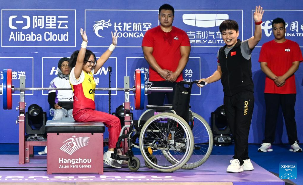 Cui Zhe of China celebrates during the Women's 45kg Final of Powerlifting at the 4th Asian Para Games in Hangzhou, east China's Zhejiang Province, Oct. 24, 2023. (Xinhua/Bei He)