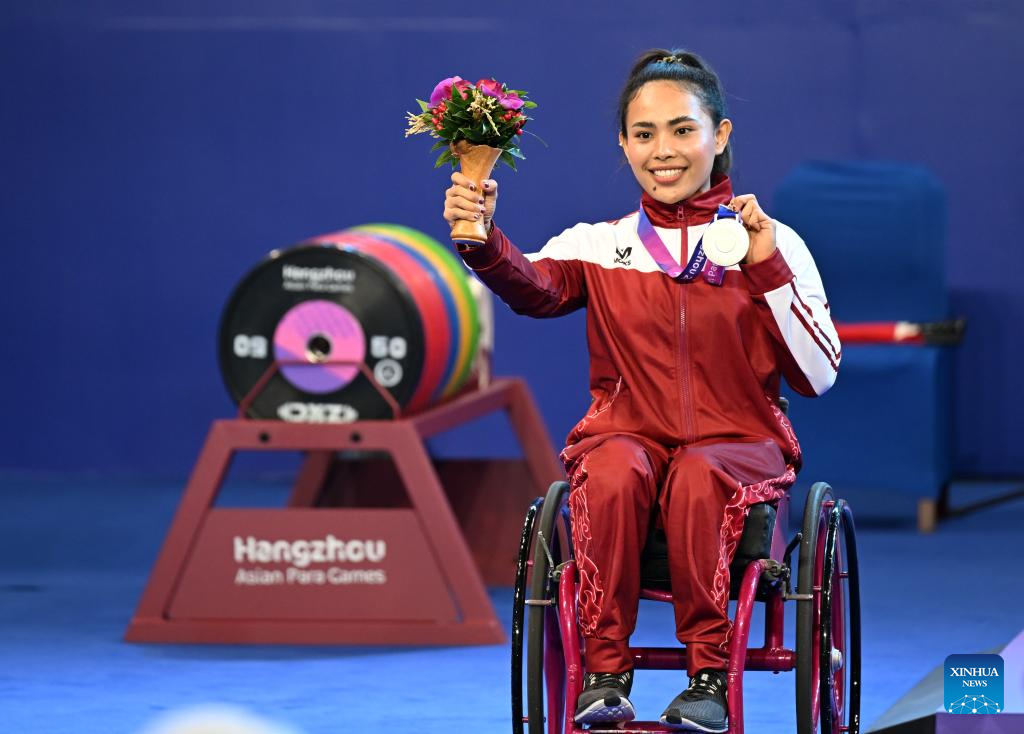 Silver medalist Ni Nengah Widiasih of Indonesia attends the awarding ceremony for the Women's 45kg of Powerlifting at the 4th Asian Para Games in Hangzhou, east China's Zhejiang Province, Oct. 24, 2023. (Xinhua/Bei He)