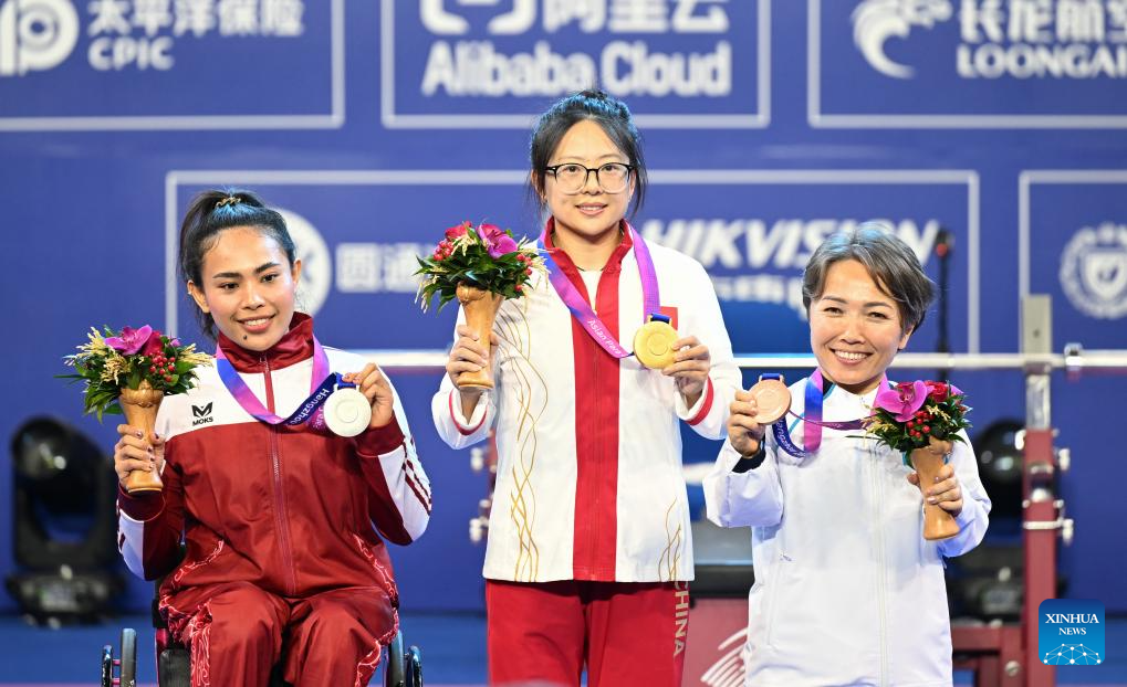 Gold medalist Cui Zhe (C) of China, silver medalist Ni Nengah Widiasih (L) of Indonesia and bronze medalist Gulim Kurmanbayeva of Kazakhstan attend the awarding ceremony for the Women's 45kg Final of Powerlifting at the 4th Asian Para Games in Hangzhou, east China's Zhejiang Province, Oct. 24, 2023. (Xinhua/Bei He)