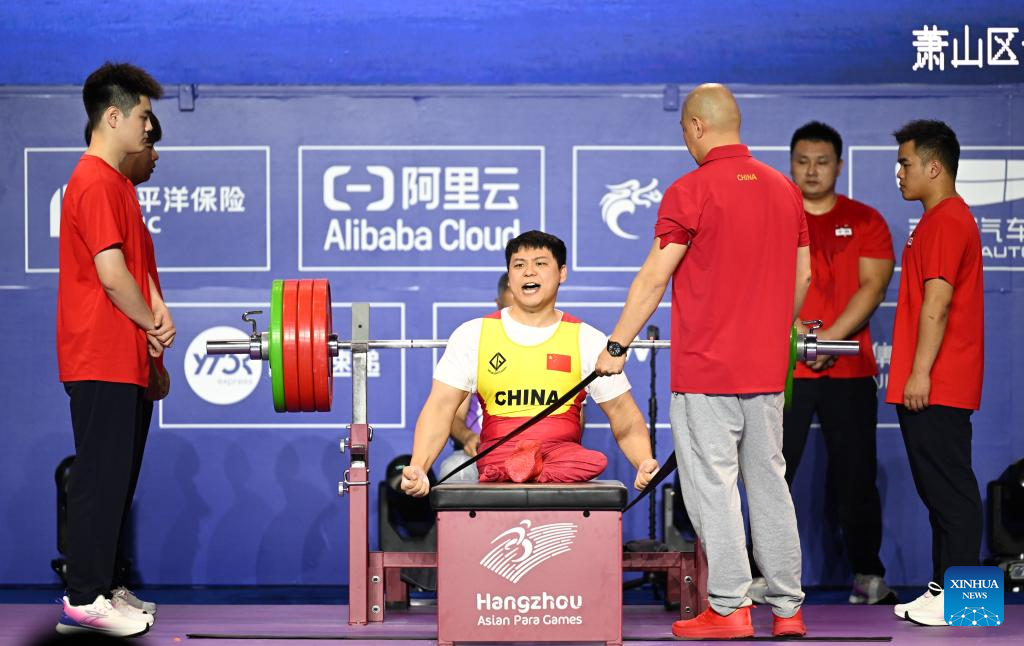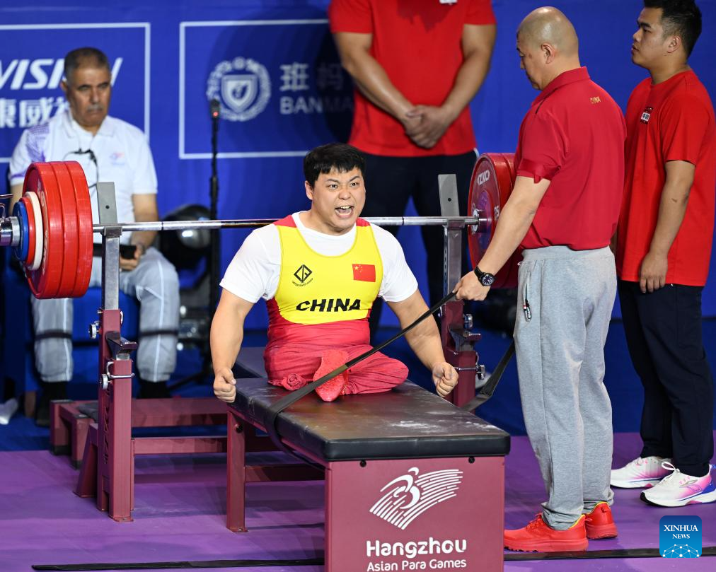 Qi Yongkai of China competes during the Men's 59kg Final of Powerlifting at the 4th Asian Para Games in Hangzhou, east China's Zhejiang Province, Oct. 24, 2023. (Xinhua/Bei He)