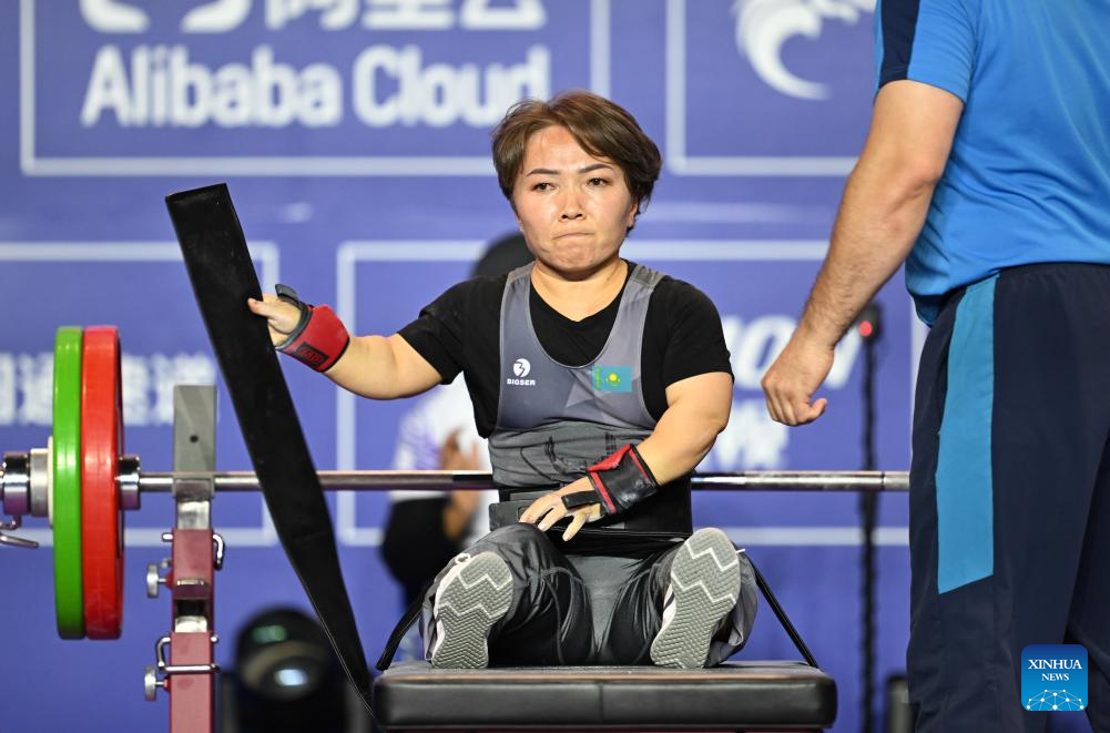 Gulim Kurmanbayeva of Kazakhstan reacts during the Women's 45kg Final of Powerlifting at the 4th Asian Para Games in Hangzhou, east China's Zhejiang Province, Oct. 24, 2023. (Xinhua/Bei He)