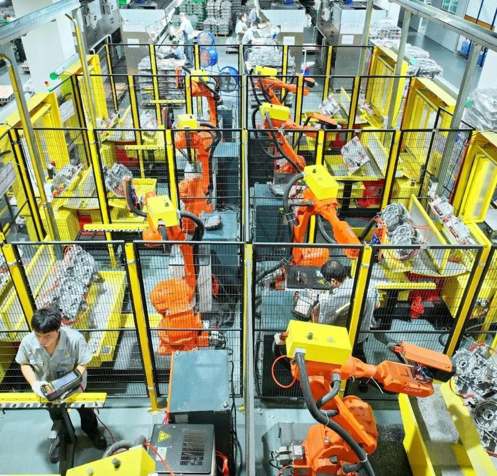 Technicians control robotic arms to produce new energy vehicle parts in a smart factory in Ganzhou, east China's Jiangxi province. (People's Daily Online/Zhu Haipeng)