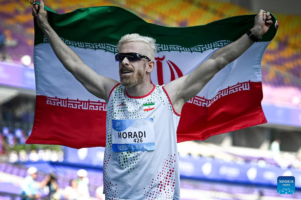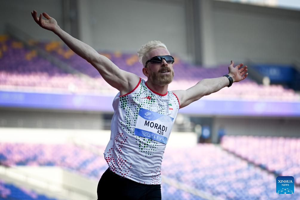 Gold medalist Mehrdad Moradi of Iran celebrates after winning the Men's 100m T12 final of Athletics at the 4th Asian Para Games in Hangzhou, east China's Zhejiang Province, Oct. 24, 2023. (Xinhua/Jiang Han)