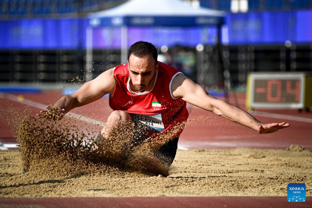 Silver medalist Amir Khosravani of Iran competes during the Men's Long Jump T12 final of Athletics at the 4th Asian Para Games in Hangzhou, east China's Zhejiang Province, Oct. 24, 2023. (Xinhua/Jiang Han)