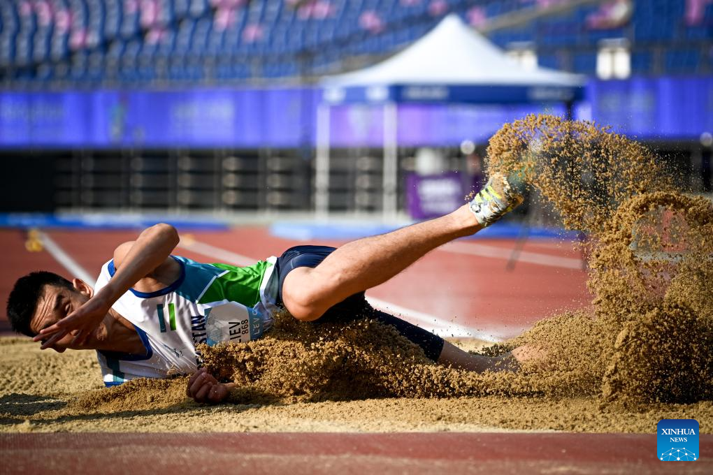 Gold medalist Doniyor Saliev of Uzbekistan competes during the Men's Long Jump T12 final of Athletics at the 4th Asian Para Games in Hangzhou, east China's Zhejiang Province, Oct. 24, 2023. (Xinhua/Jiang Han)