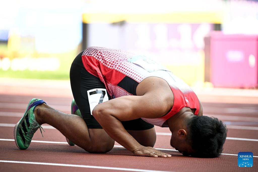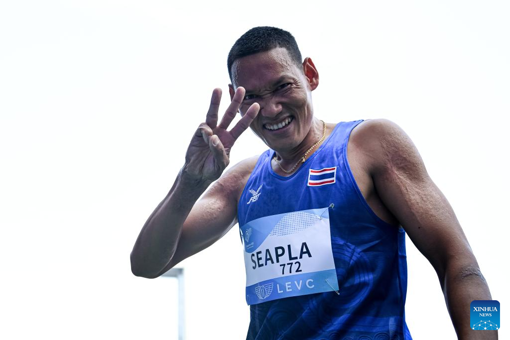 Bronze medalist Jafa Seapla of Thailand reacts after the Men's 400m T64 final of Athletics at the 4th Asian Para Games in Hangzhou, east China's Zhejiang Province, Oct. 24, 2023. (Xinhua/Jiang Han)
