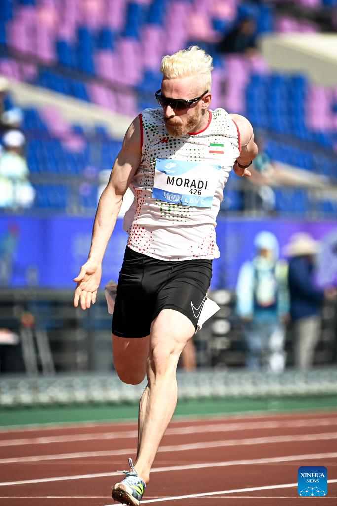 Gold medalist Mehrdad Moradi of Iran sprints during the Men's 100m T12 final of Athletics at the 4th Asian Para Games in Hangzhou, east China's Zhejiang Province, Oct. 24, 2023. (Xinhua/Jiang Han)
