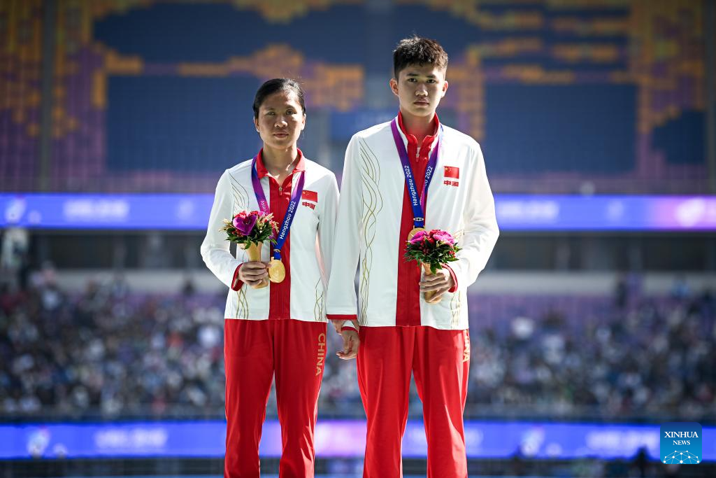 Gold medalists Liu Cuiqing (L) and her guide Chen Shengming of China attend the awarding ceremony for the Women's 100m T11 of Athletics at the 4th Asian Para Games in Hangzhou, east China's Zhejiang Province, Oct. 24, 2023. (Xinhua/Jiang Han)