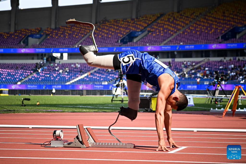 Bronze medalist Jafa Seapla of Thailand warms up before the Men's 400m T64 final of Athletics at the 4th Asian Para Games in Hangzhou, east China's Zhejiang Province, Oct. 24, 2023. (Xinhua/Jiang Han)