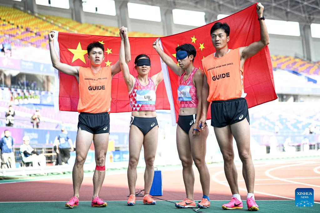 Gold medalists Liu Cuiqing (2nd L) and her guide Chen Shengming (1st L) of China, silver medalists Zhou Guohua (2nd R) and her guide Jia Dengpu celebrate after the Women's 100m T11 Final of Athletics at the 4th Asian Para Games in Hangzhou, east China's Zhejiang Province, Oct. 24, 2023. (Xinhua/Jiang Han)