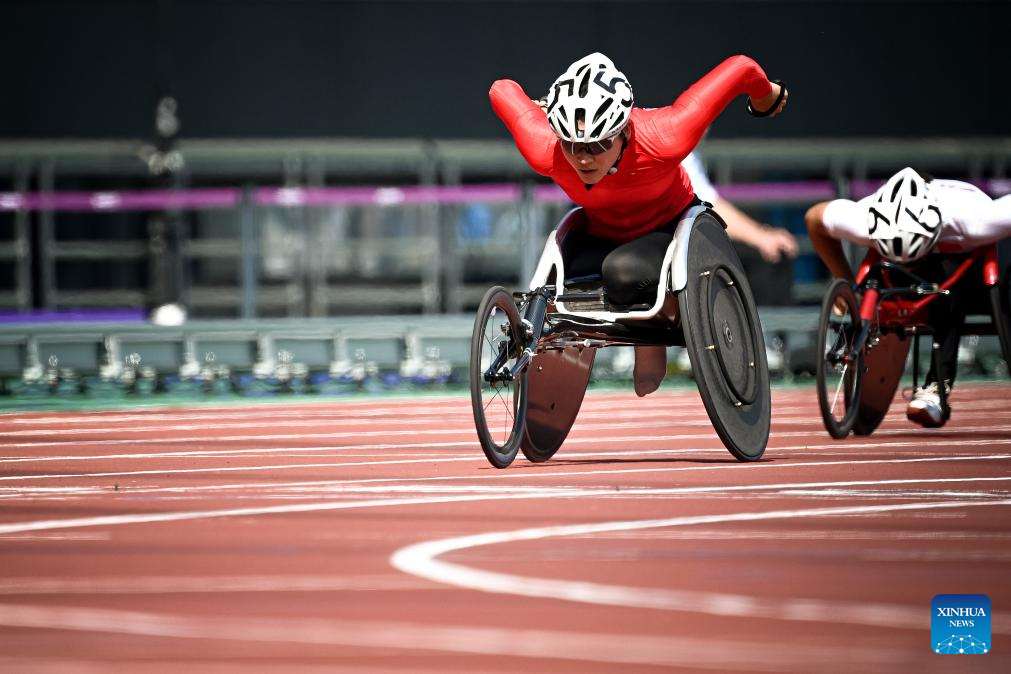 Gold medalist Tian Yajuan of China competes during the Women's 400m T54 final of Athletics at the 4th Asian Para Games in Hangzhou, east China's Zhejiang Province, Oct. 24, 2023. (Xinhua/Jiang Han)