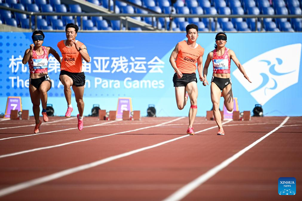 Liu Cuiqing (1st R) and her guide Chen Shengming (2nd R) of China, Zhou Guohua (1st L) and her guide Jia Dengpu compete during the Women's 100m T11 Final of Athletics at the 4th Asian Para Games in Hangzhou, east China's Zhejiang Province, Oct. 24, 2023. (Xinhua/Jiang Han)