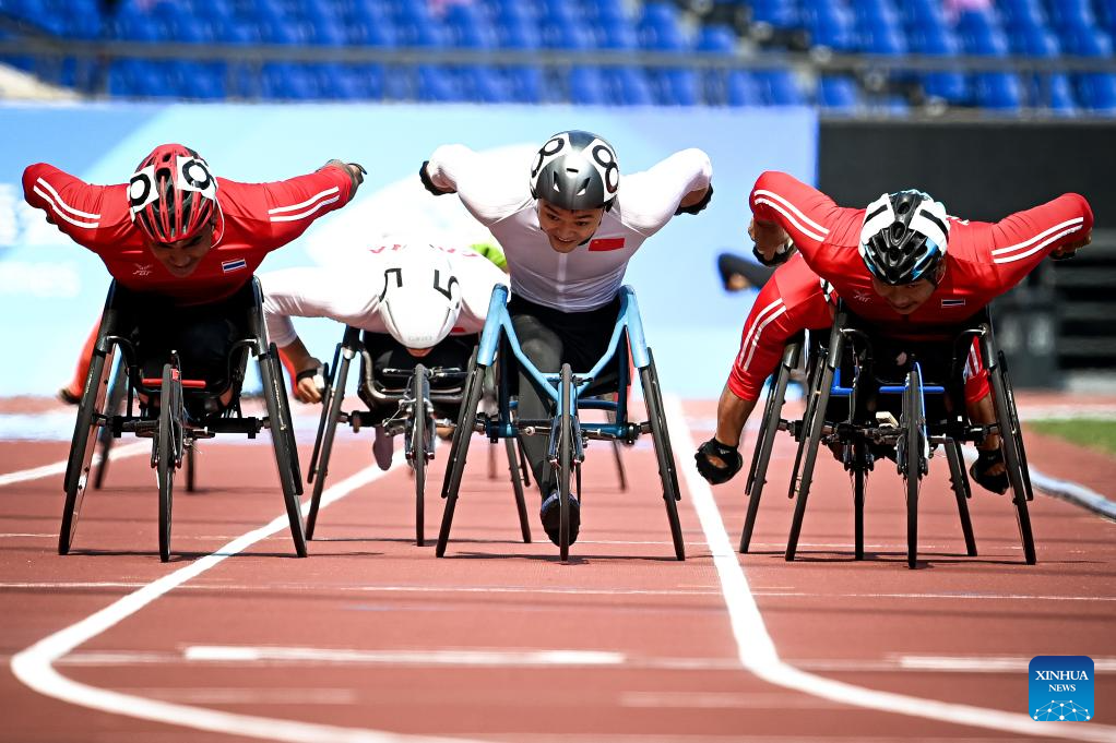 Gold medalist Prawat Wahoram (L) of Thailand, silver medalist Putharet Khongrak (R) of Thailand and bronze medalist Hu Yang of China sprint during the Men's 1500m T54 final of Athletics at the 4th Asian Para Games in Hangzhou, east China's Zhejiang Province, Oct. 24, 2023. (Xinhua/Jiang Han)
