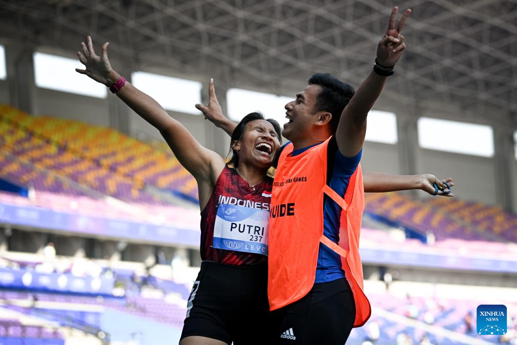 Gold medalist Made Arianti Putri Ni (L) of Indonesia celebrates with her guide Bayu Aji Laksono after winning the Women's 100m T12 final of Athletics at the 4th Asian Para Games in Hangzhou, east China's Zhejiang Province, Oct. 24, 2023. (Xinhua/Jiang Han)