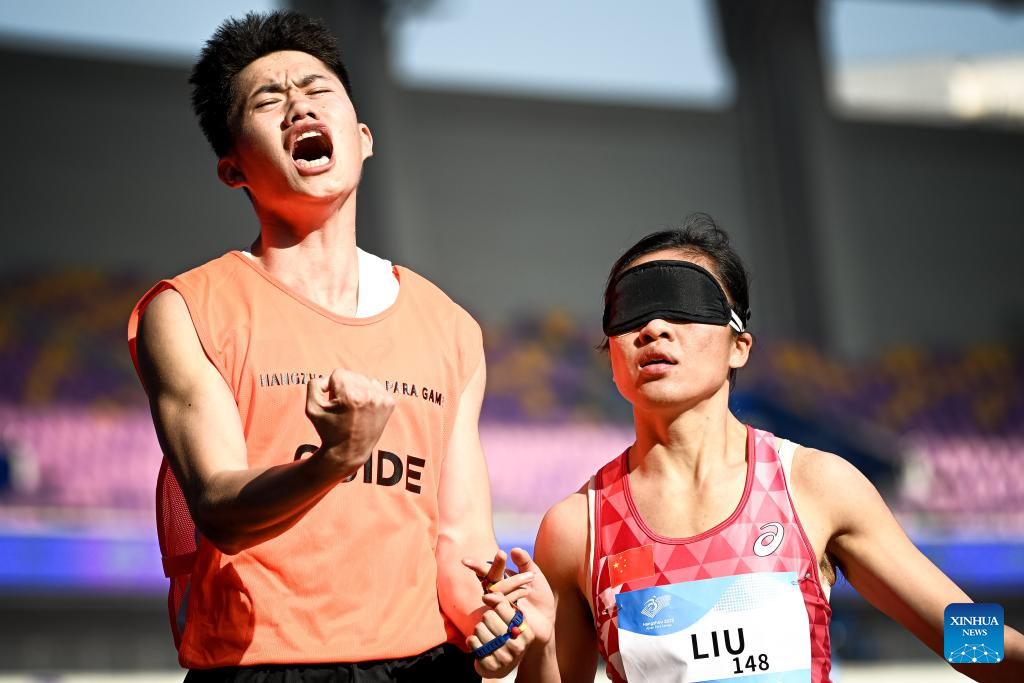 Liu Cuiqing (R) and her guide Chen Shengming of China celebrate after the Women's 100m T11 Final of Athletics at the 4th Asian Para Games in Hangzhou, east China's Zhejiang Province, Oct. 24, 2023. (Xinhua/Jiang Han)