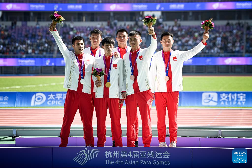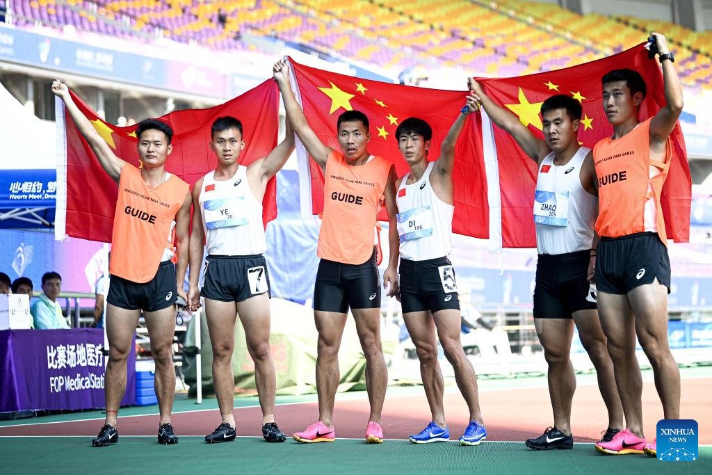Gold medalists Di Dongdong (3rd R) and his guide Lian Jiageng (3rd L) of China, silver medalists Zhao Pingan (2nd R) and his guide Wang Shengyuan (1st R) of China, bronze medalists Ye Tao (2nd L) and Lin Jianxin of China celebrate after the Men's 100m T11 Final of Athletics at the 4th Asian Para Games in Hangzhou, east China's Zhejiang Province, Oct. 24, 2023. (Xinhua/Jiang Han)
