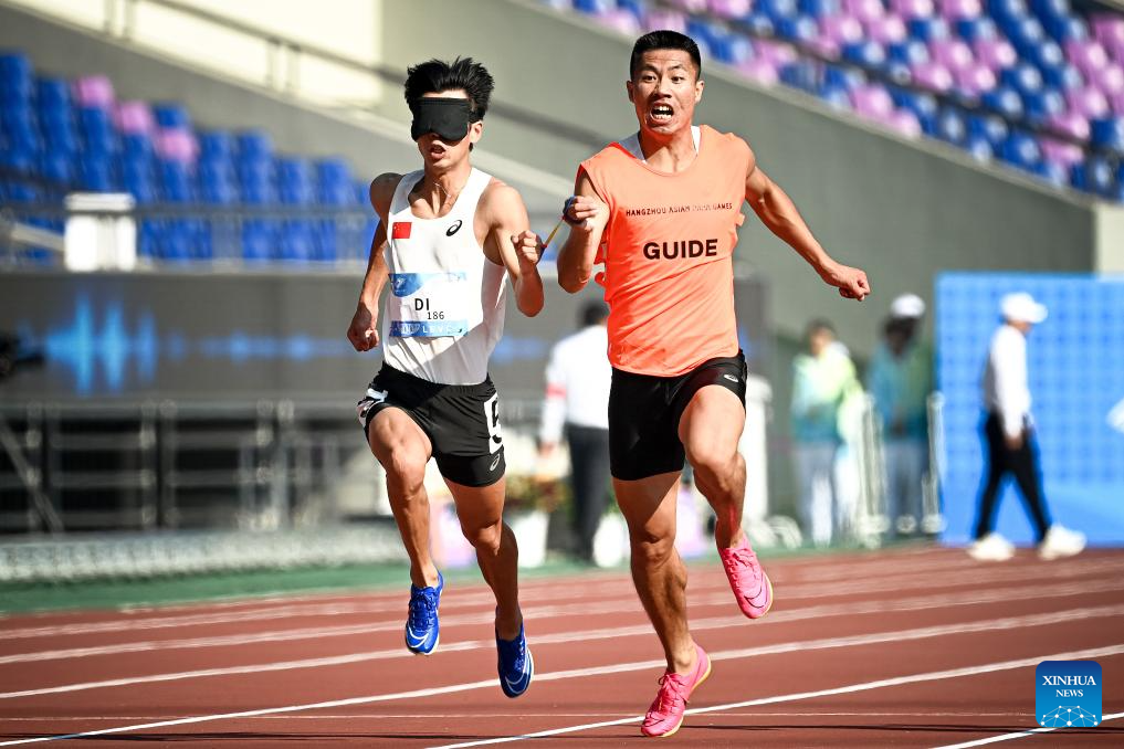 Di Dongdong (L) and his guide Lian Jiageng of China compete during the Men's 100m T11 Final of Athletics at the 4th Asian Para Games in Hangzhou, east China's Zhejiang Province, Oct. 24, 2023. (Xinhua/Jiang Han)