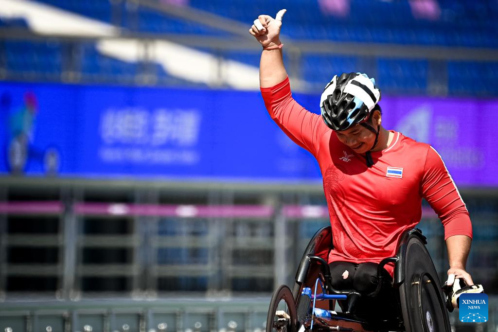 Silver medalist Putharet Khongrak of Thailand celebrates after the Men's 1500m T54 final of Athletics at the 4th Asian Para Games in Hangzhou, east China's Zhejiang Province, Oct. 24, 2023. (Xinhua/Jiang Han)