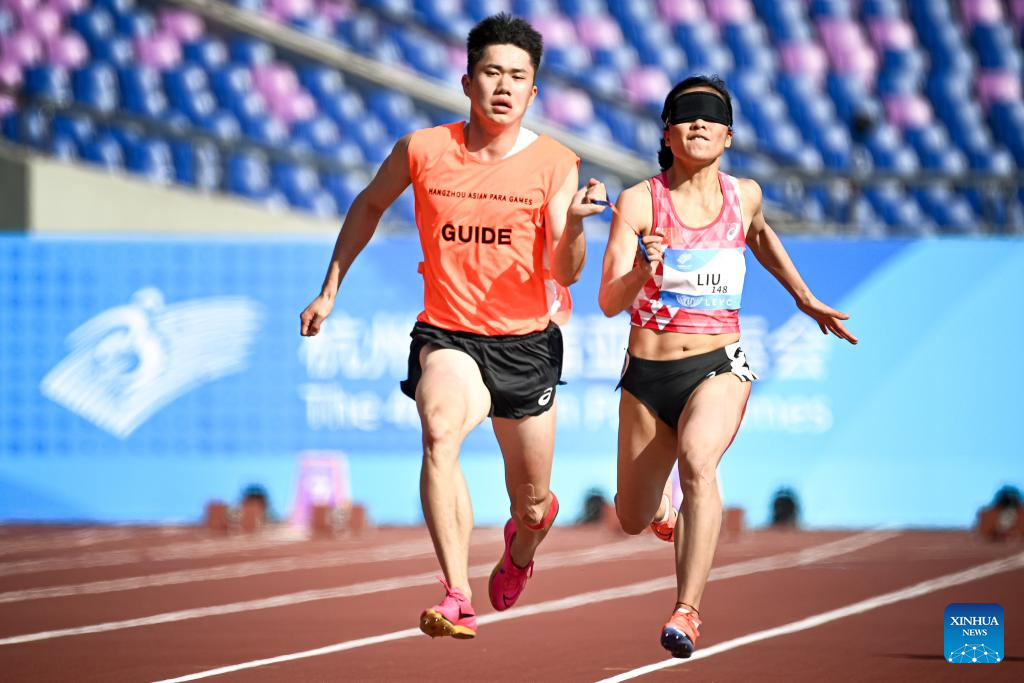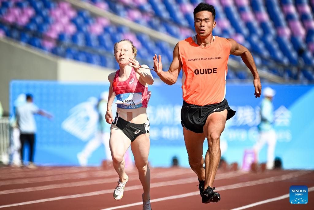 Bronze medalist Shen Yaqin (L) of China runs with her guide Li Wen during the Women's 100m T12 final of Athletics at the 4th Asian Para Games in Hangzhou, east China's Zhejiang Province, Oct. 24, 2023. (Xinhua/Jiang Han)