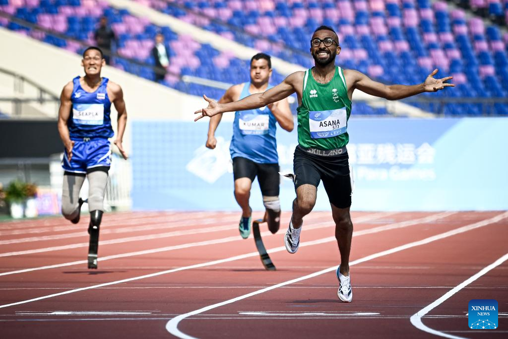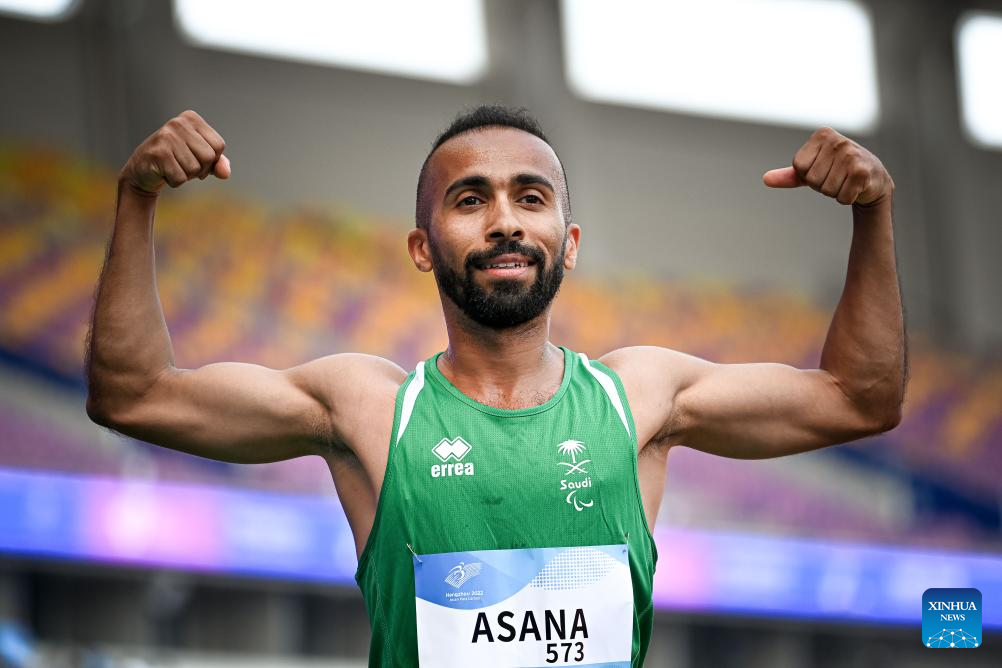 Gold medalist Nour Mohammed S Asana of Saudi Arabia celebrates after winning the Men's 400m T64 final of Athletics at the 4th Asian Para Games in Hangzhou, east China's Zhejiang Province, Oct. 24, 2023. (Xinhua/Jiang Han)