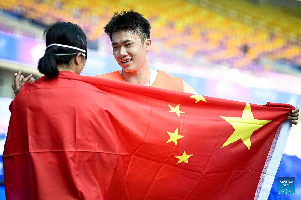 Gold medalists Di Dongdong (L) and his guide Lian Jiageng of China attend the awarding ceremony for the Men's 100m T11 of Athletics at the 4th Asian Para Games in Hangzhou, east China's Zhejiang Province, Oct. 24, 2023. (Xinhua/Jiang Han)