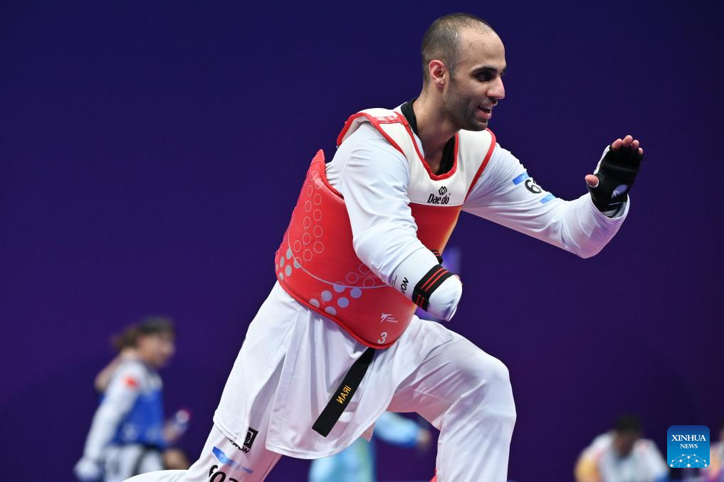 Iran's Mahdi Pourrahnamaahmadgourabi celebrates after winning the Men's K44 70KG Gold Medal Contest of Taekwondo against China's Chen Shihe at the 4th Asian Para Games in Hangzhou, east China's Zhejiang Province, Oct. 24, 2023. (Xinhua/Huang Zongzhi)
