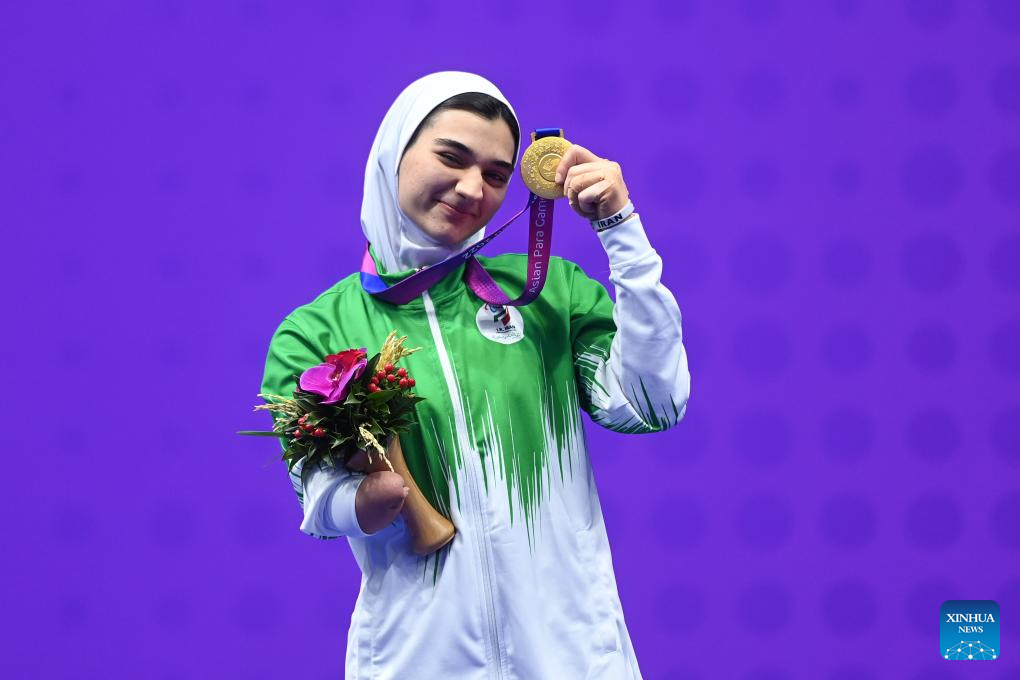 Gold medalist Iran's Roza Ebrahimi poses with her medal during the awarding ceremony of the Women's K44 57KG event of Taekwondo at the 4th Asian Para Games in Hangzhou, east China's Zhejiang Province, Oct. 24, 2023. (Xinhua/Huang Zongzhi)