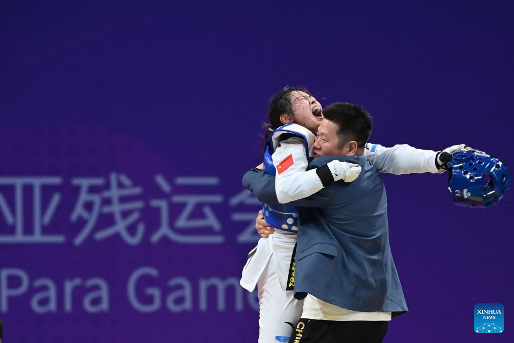China's Yao Yinan (L) celebrates after winning the Women's K44 65KG Gold Medal Contest of Taekwondo against Iran's Romina Chamsouraki at the 4th Asian Para Games in Hangzhou, east China's Zhejiang Province, Oct. 24, 2023. (Xinhua/Huang Zongzhi)