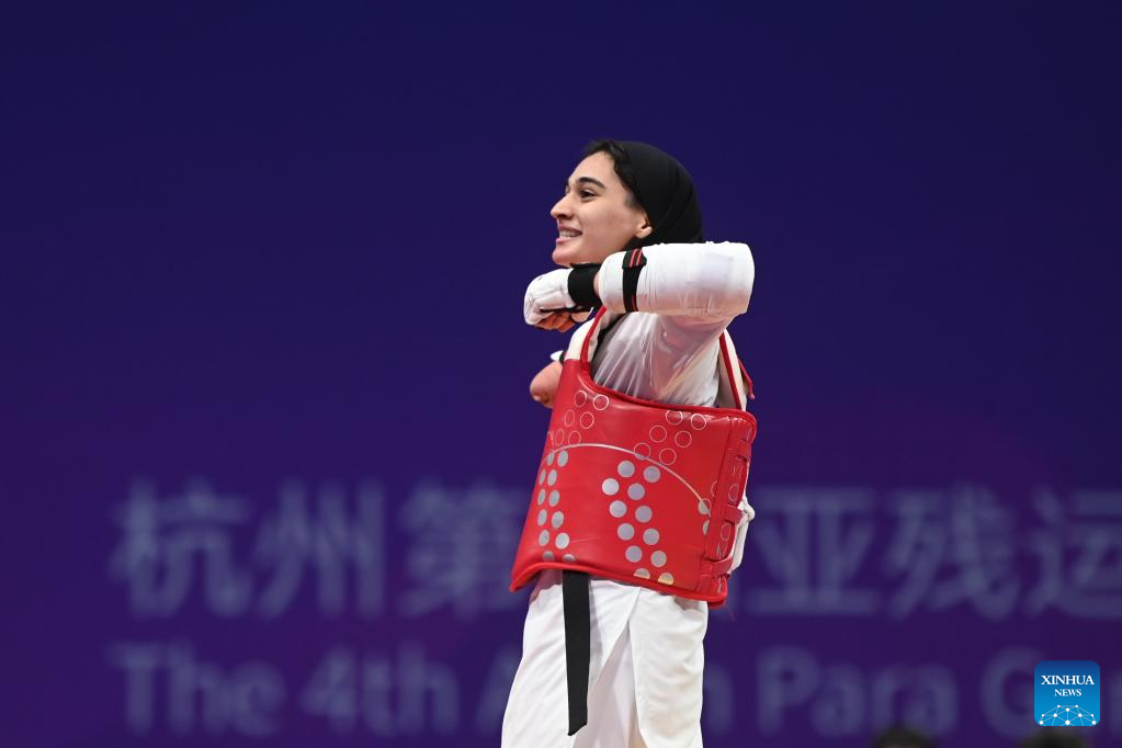 Iran's Roza Ebrahimi celebrates after winning the Women's K44 57KG Gold Medal Contest of Taekwondo against Kazakhstan's Kamilya Dosmalova at the 4th Asian Para Games in Hangzhou, east China's Zhejiang Province, Oct. 24, 2023. (Xinhua/Huang Zongzhi)