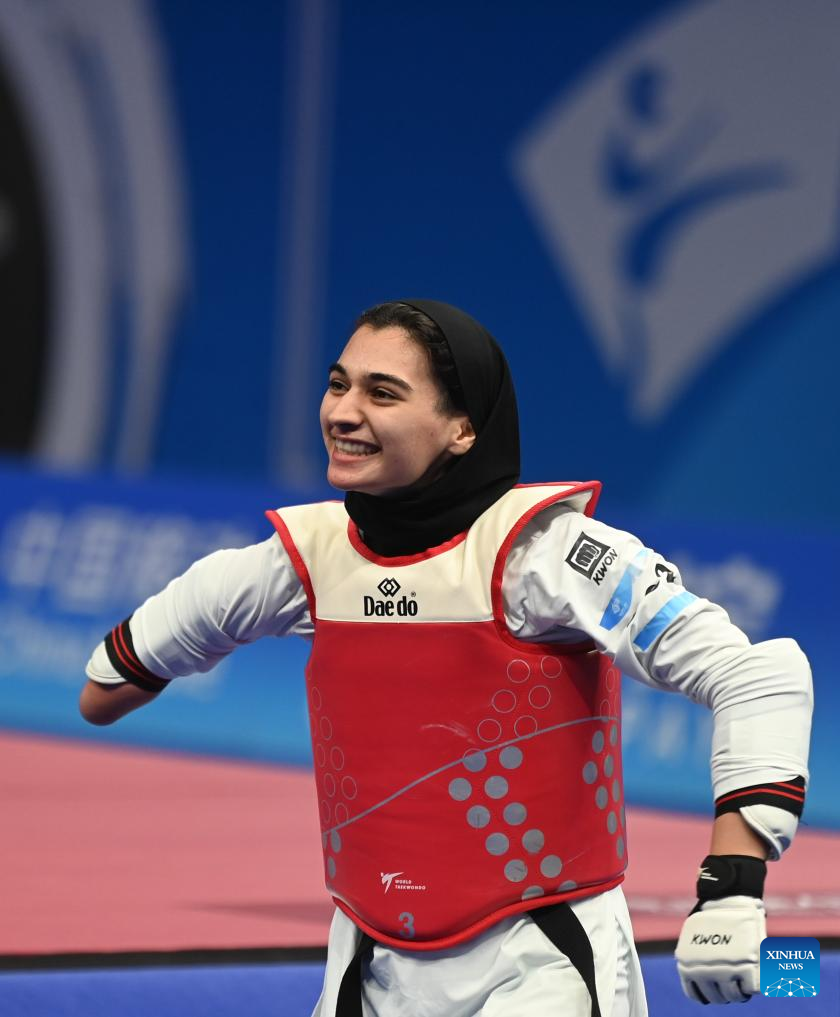 Iran's Roza Ebrahimi (C) celebrates after winning the Women's K44 57KG Gold Medal Contest of Taekwondo against Kazakhstan's Kamilya Dosmalova at the 4th Asian Para Games in Hangzhou, east China's Zhejiang Province, Oct. 24, 2023. (Xinhua/Huang Zongzhi)