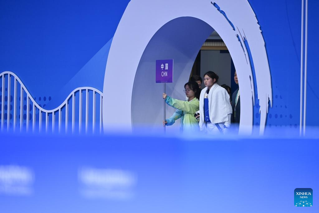 China's Yao Yinan (R) enters the court before the Women's K44 65KG Gold Medal Contest of Taekwondo against Iran's Romina Chamsouraki at the 4th Asian Para Games in Hangzhou, east China's Zhejiang Province, Oct. 24, 2023. (Xinhua/Huang Zongzhi)