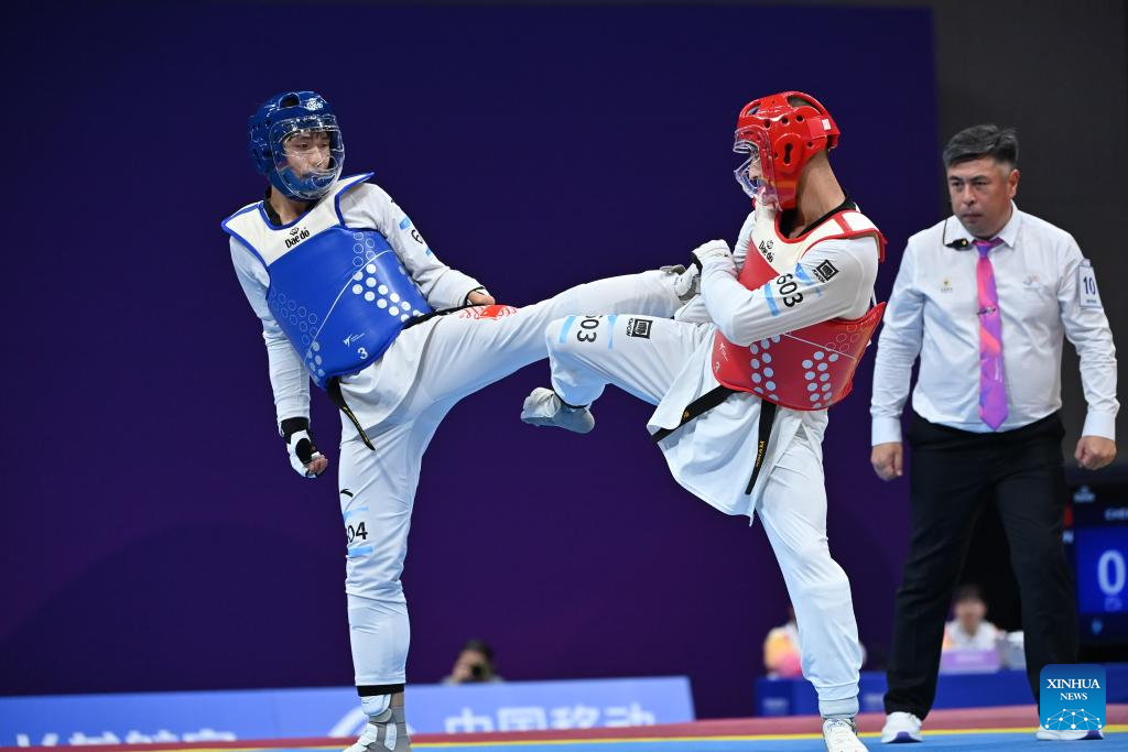 Iran's Mahdi Pourrahnamaahmadgourabi (C) competes against China's Chen Shihe during their Men's K44 70KG Gold Medal Contest of Taekwondo at the 4th Asian Para Games in Hangzhou, east China's Zhejiang Province, Oct. 24, 2023. (Xinhua/Huang Zongzhi)