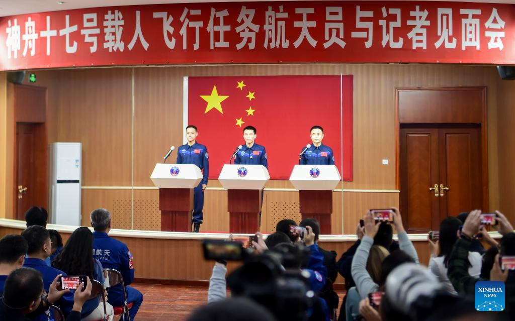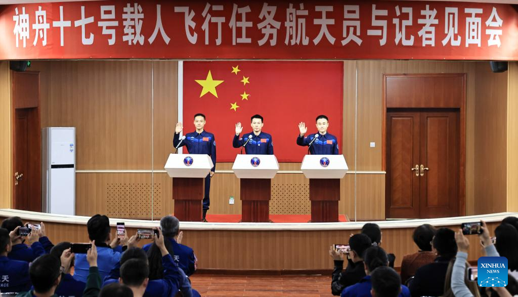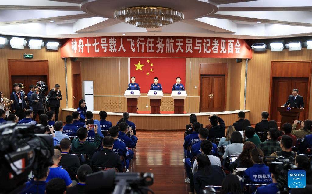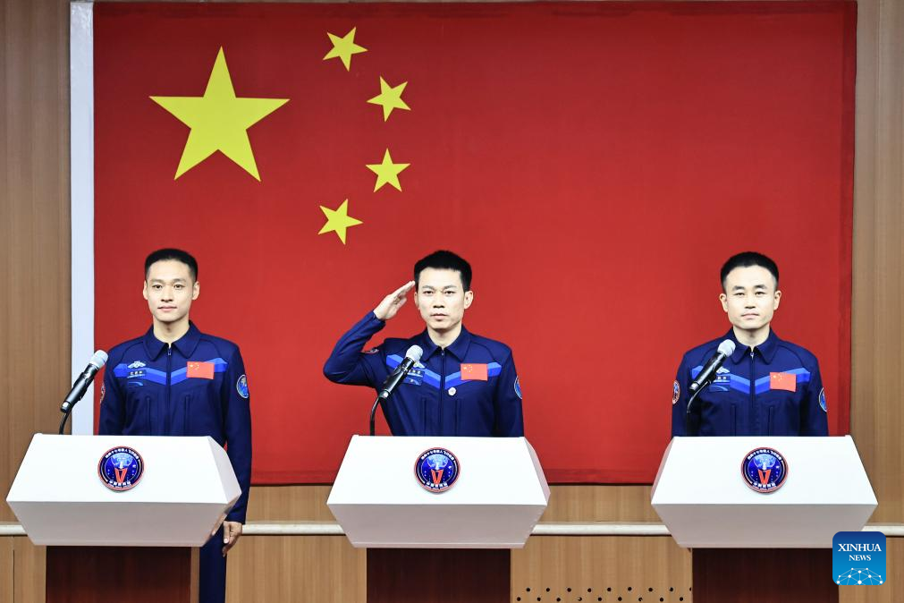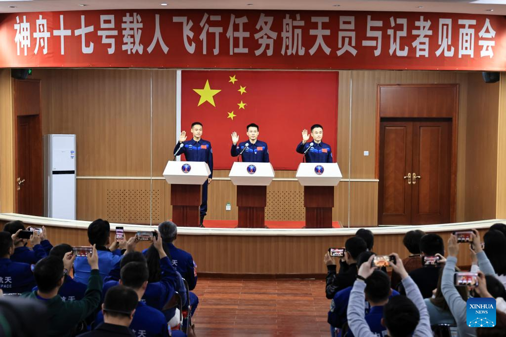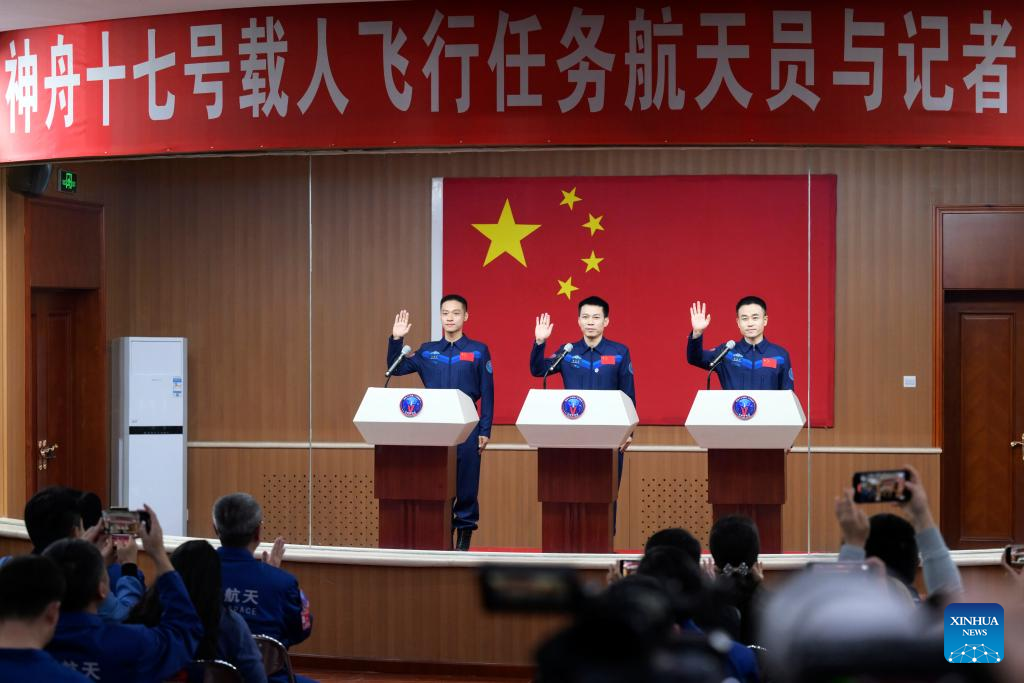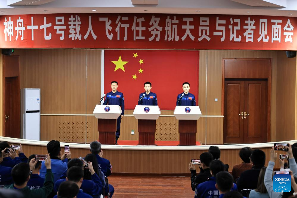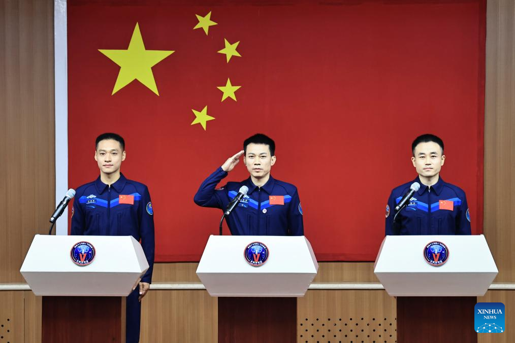 JIUQUAN, Oct. 25 (Xinhua) -- Tang Hongbo, Tang Shengjie, and Jiang Xinlin, the three Chinese astronauts for the upcoming Shenzhou-17 spaceflight mission, met the press on Wednesday.