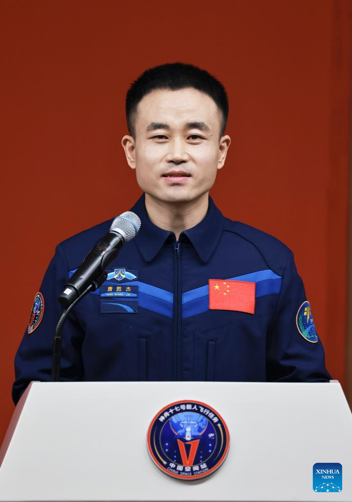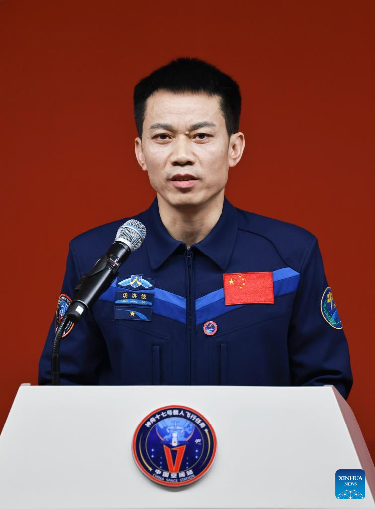 Tang Hongbo, one of the three Chinese astronauts who will carry out the Shenzhou-17 spaceflight mission, meets the press at the Jiuquan Satellite Launch Center in northwest China on Oct. 25, 2023. (Xinhua/Li Gang)