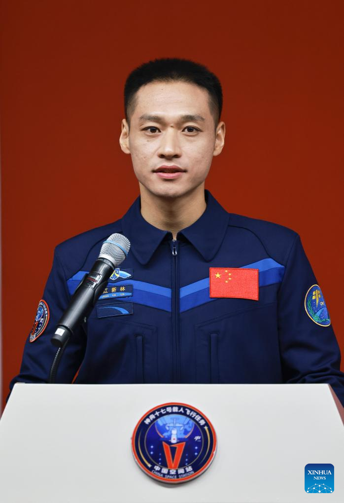 Jiang Xinlin, one of the three Chinese astronauts who will carry out the Shenzhou-17 spaceflight mission, meets the press at the Jiuquan Satellite Launch Center in northwest China on Oct. 25, 2023. (Xinhua/Li Gang)