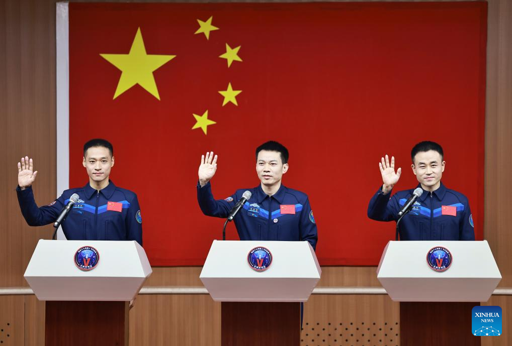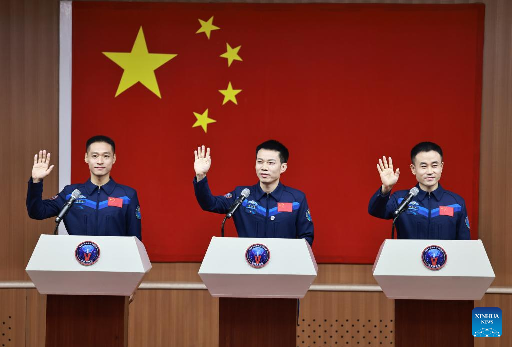 Chinese astronauts Tang Hongbo, Tang Shengjie and Jiang Xinlin for the upcoming Shenzhou-17 spaceflight mission meet the press at the Jiuquan Satellite Launch Center in northwest China on Oct. 25, 2023. (Xinhua/Li Gang)