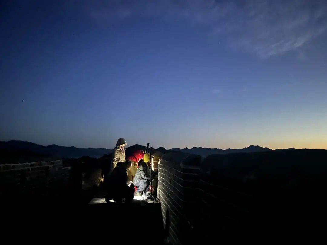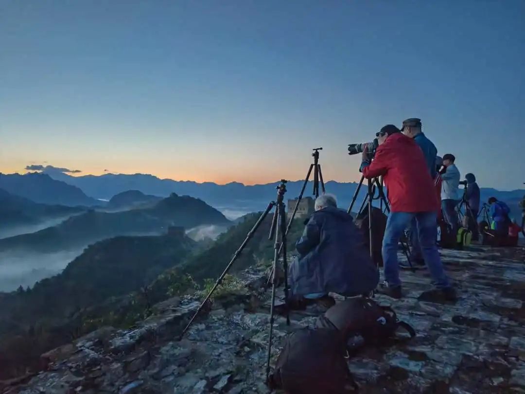 Villagers of Hualougou village guide photography enthusiasts to a spot on the Great Wall before dawn to take photos at sunrise. (People's Daily/Zhi Chunli)