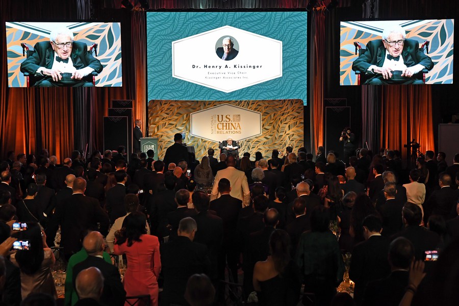 Former U.S. Secretary of State Dr. Henry A. Kissinger (C and on the screens) speaks at the annual Gala Dinner of the National Committee on U.S.-China Relations in New York, the United States, on Oct. 24, 2023. (Xinhua/Li Rui)