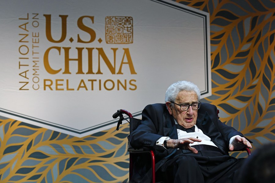 Former U.S. Secretary of State Dr. Henry A. Kissinger speaks at the annual Gala Dinner of the National Committee on U.S.-China Relations in New York, the United States, on Oct. 24, 2023. (Xinhua/Li Rui)