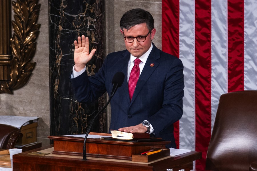 Newly-elected U.S. House Speaker Mike Johnson takes the oath of office in the House Chamber in Washington, D.C., the United States, on Oct. 25, 2023. (Photo by Aaron Schwartz/Xinhua)