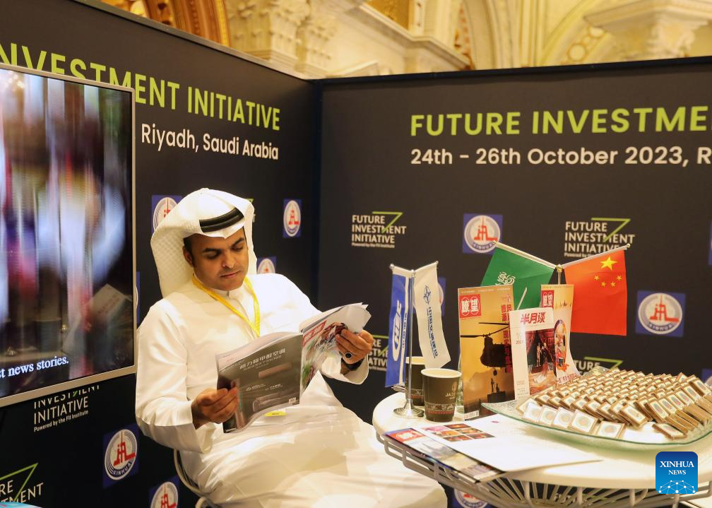 A man reads a magazine at the exhibition stand of Xinhua News Agency during the seventh Future Investment Initiative (FII7) forum in Riyadh, Saudi Arabia, Oct. 24, 2023. The forum kicked off on Tuesday in Riyadh under the theme "The New Compass." (Xinhua/Wang Dongzhen)