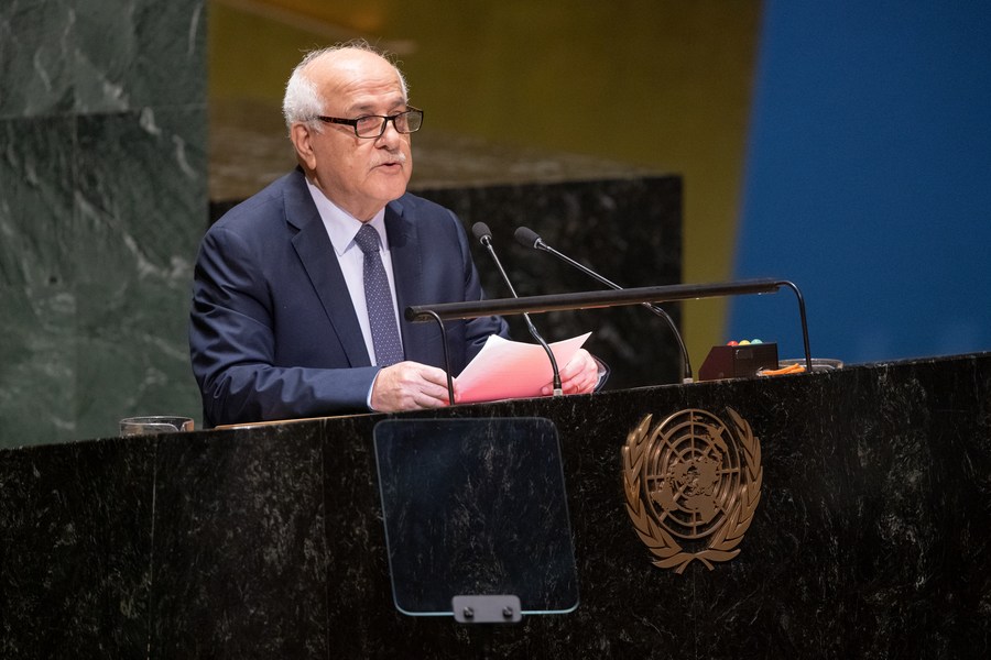 Palestine's UN ambassador Riyad Mansour speaks at the 10th Emergency Special Session of the General Assembly on the Israeli-Palestinian conflict at the UN headquarters in New York, on Oct. 26, 2023. (Manuel Elias/UN Photo/Handout via Xinhua)