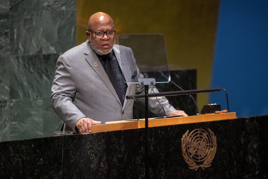 UN General Assembly President Dennis Francis speaks at the 10th Emergency Special Session of the General Assembly on the Israeli-Palestinian conflict at the UN headquarters in New York, on Oct. 26, 2023. (Manuel Elias/UN Photo/Handout via Xinhua)