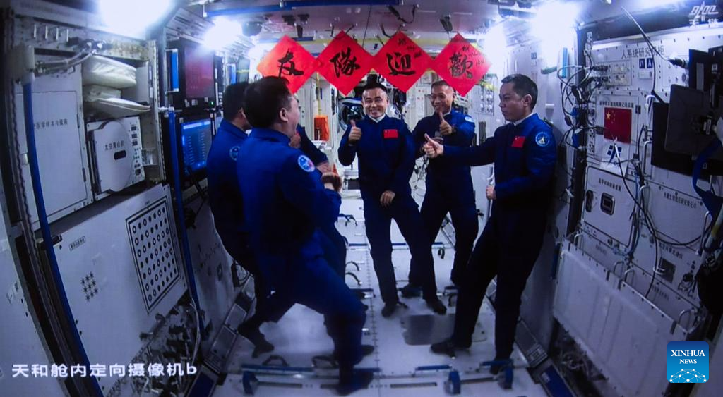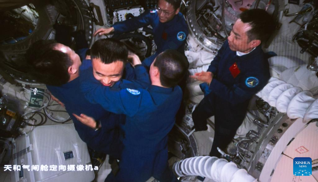 The Shenzhou-16 crew opened the hatch at 7:34 p.m. (Beijing Time). The three space station occupants greeted the new arrivals, and they took group pictures.