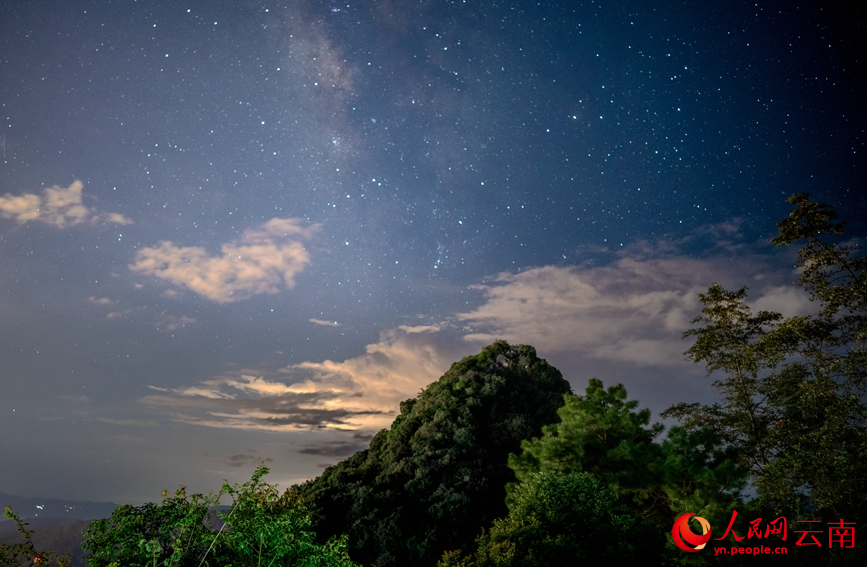 Photo shows a stunning view of the starlit sky over Pu'er mountain in Ning'er Hani and Yi Autonomous County, Pu'er city, southwest China's Yunnan Province. (Photo/Rao Xuesong)